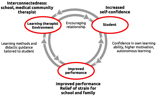 The fundamental principle of the learning therapy is to foster the child's strengths in order to compensate for his or her weaknesses. Individual intervention increases th student's scholastic performance, the trust in his or her own abilities, and the motivation to learn. A positive learning structure is re-established and leads to autonomous, self-dependent learning behavior, bringing about an improved learning environment at school and an easing of familial stress.